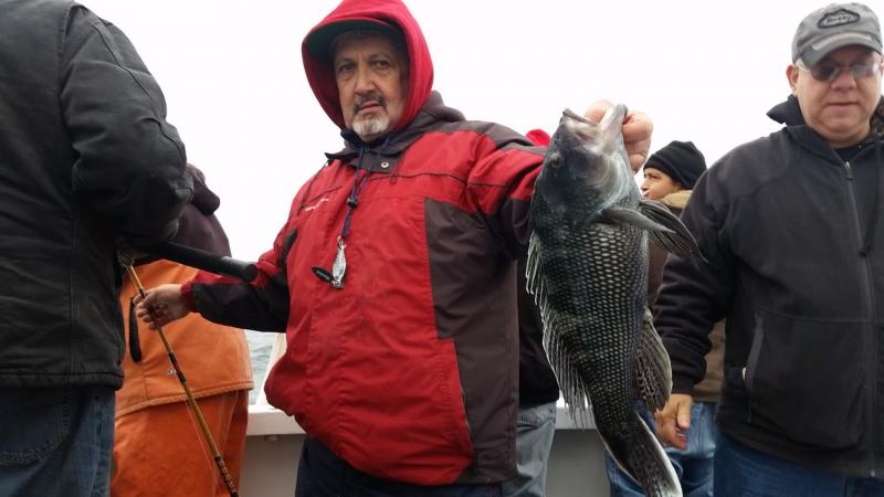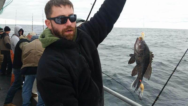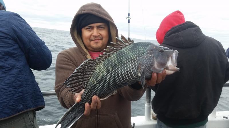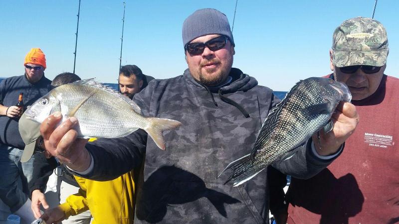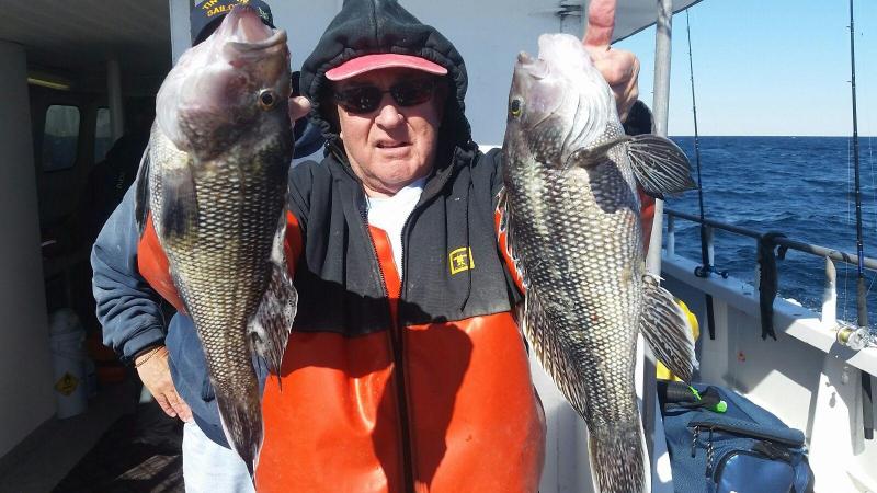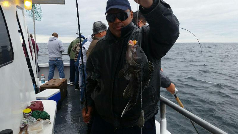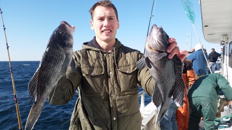 10-23-15 Another fun day out there,,loads of action on almost every drop...More weeding through some smaller sea bass today than yesterday but everyone caught fish,,,,some guys did catch a limit,,some had only a few or maybe 8-10,,some guys were just in the right spot today and did better than others,,,few spots we had some really jumbo porgies come up,,,it was a nice bonus but overall I was happy with the catch as a whole and the life on every spot..it was fun...The whole weekend looks like it gonna be nice,,,come down and get in on the action..we had some keeper codfish in the mix as well,,,and yesterday we had a grunt come up and today a pinfish ..both all the way up from florida..fun day all around..see ya tomorrow...pics