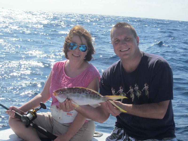 I had Wendy and Mike Hill out today, a more fun, enthusiastic, generous couple you will not find ! We worked our way north and kite fished and bottom fished at the same time, the breeze today turned on the fish and we got bites on all of the rods. We ended up with a couple of mahi, yellowtail snapper, runners, and a 58 inch 41 pound king. Action packed 4 hour trip. Tight Lines –Rich
