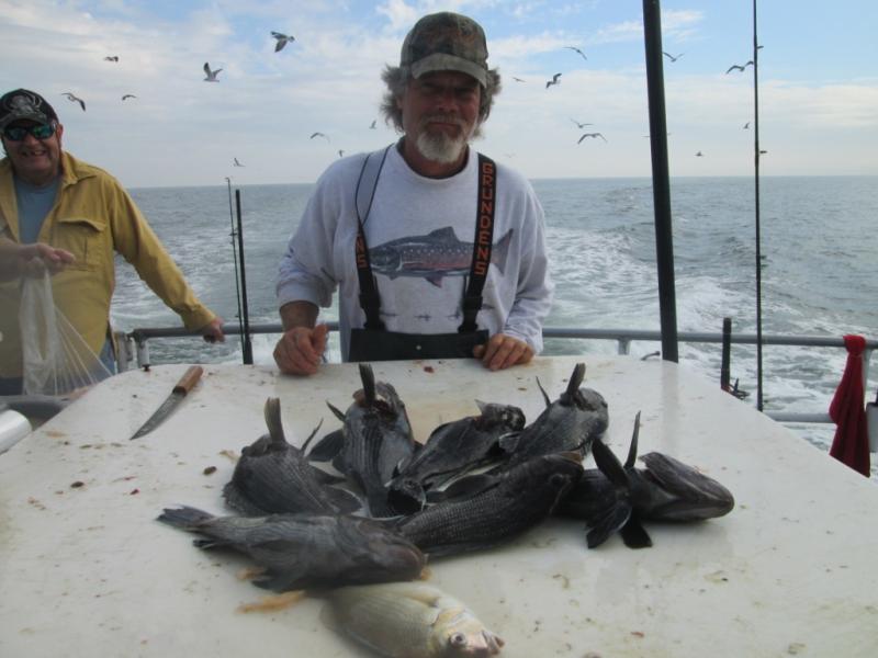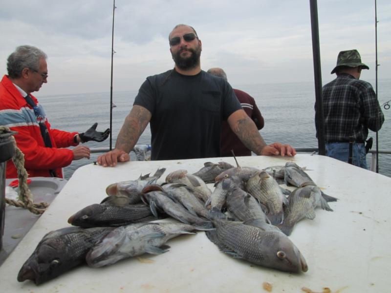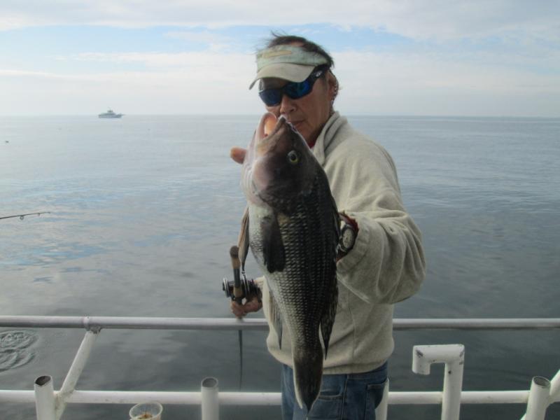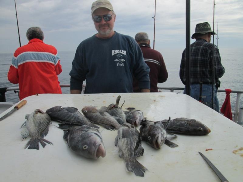 I went back to where I started yesterday and today the sea bass were hungry and chewing. It was good fishing right away with plenty of keepers. the fishing stayed good all day but the keeper ratio was much better first thing. Towards the end of the day some porgies started to bite. The dogs were on and off all day. Most had 8 to 15 keeper sea bass today on what felt like a summer day. Check out how flat the ocean was. The water is very clean and light leaders with small hooks and baits works best. Once again the fish were full of crabs.
