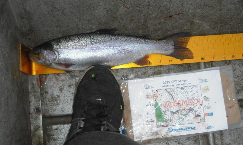 I actually abandoned those tactics and tried and tried for bigger trout or bass in other ways but nothing I tried got a touch! Except for one nice perch to end the day. Next to zero wind, warm...merry Xmas. Good thing there is plenty of good open water fishing because if the extended forecasted temps are right we won't have ice through January! Water temp 48 in the morning...wow. My brightest pink bow escaped through the giant hole in my net of course I wanted a pic of it, oh well. All I have is this pic I took for the online fishing contest on onlinefishingtournament.com. All fish were about the same except the brilliantly colored one that escaped and all released since I got my first ever blackfish limit Saturday and a bonus sea bass and a keeper striper ![]()