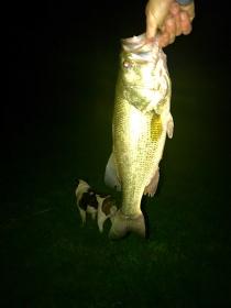 While my plan was to head to the Raritan to try for some smallies last night life intervened and I instead ended up at the local pond on a combined Dogwalk/fishing excursion. Despite fishing this pond more than anywhere else it rarely produces for me, but when it does it is usually a nice sized fish. Last night was no exception. Grabbed the dog and walked over to park around 11 with two poles and the last beer from the fridge. I had a weedless topwater frog on one pole since that is probably the most abundant food source at this place and on the other pole I put on a Texas rigged superfluke jerk bait with a 1/8 bullet sinker. I have never had much luck with soft plastic jerk baits though so I hedged my bets by using a snap leader so I could swap out lures if necessary (I rarely ever use leaders with soft plastics). I had a couple topwater blowups on the frog but the damn fish kept missing so I switched to the fluke. I am glad I did, within minutes I snagged this nice LMB, possibly the longest Largie I have caught and maybe even a PB in weight as well. If the girth of this fish had matched the length it would have been a PB for sure. I estimate 18-19". I ended up getting a little wet on the release because the shoreline was thick with vegetation and I wanted to make sure this fella made it safely back into deeper waters (so I can hopefully catch him again after he fills out).
