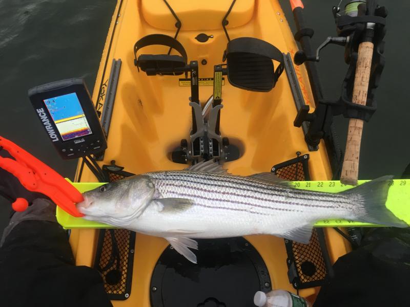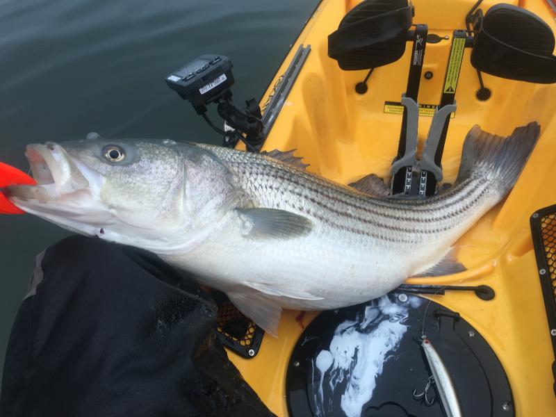 Well it's been a loooooong time since I have been out striper fishing in the yak. I had a small window this morning to get it done. It was a wet ride with the rain, but my dry suit kept me dry inside. I fished from about 7:30am to 9:30am and got 5 to 35". I think the large one "liked" me a lot...see the pic.... sheesh, he could've asked me my name and kissed me first