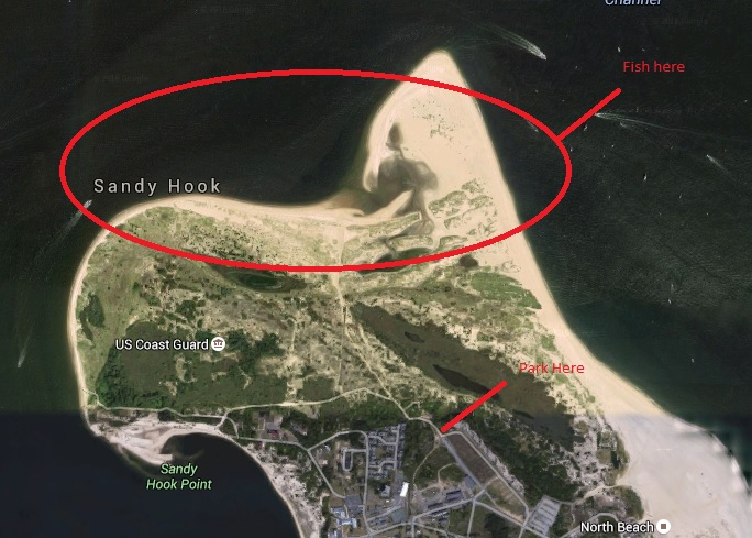 Fishermen are a strange breed. They are really good about helping out with all sorts of questions except information on their fishing spots. Usually they will yell at you if you "spot burn"... post your fishing spot. Anyway, I think it's stupid and we should help each other out. If you're going to try surf fishing, I would suggest Sandy Hook. You can try the ocean and bay side without having to drive. If you park at the 9 Gun Battery area you can walk to the tip. You better be in good shape because it's a long walk in the sand (about a mile) to get to the tip.