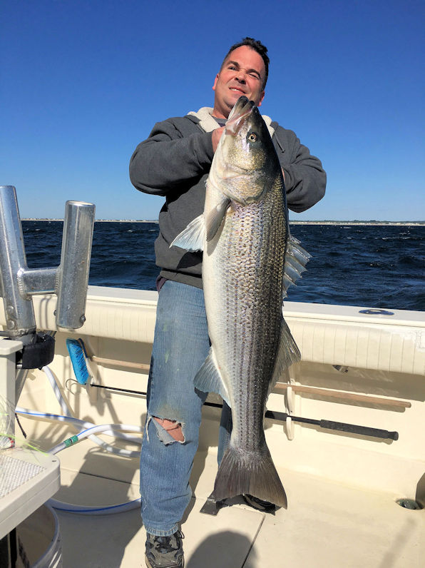 Long time Bounty Hunter supporter Chris Cameroni had his charter on board today. Along with Chris were Carmine, Pete, Anthony, Chris, & Jack. We cleared the Inlet early expecting the wind to diminish as the morning went on. Paul ran up to the area we had them the day before and put out the Spoons. Within an hour we had our first Bass which measured 47" and weighed in at 39 lbs. By mid morning the weather deteriorated and we found ourselves in Gale conditions with winds at 30 knots +. It was a bit sporty for the charter and trolling a course was difficult. We called it a day early and were back at the dock by midday.