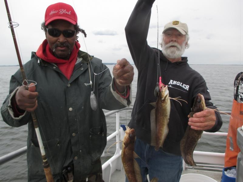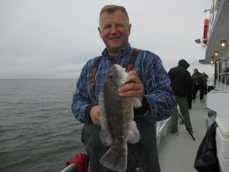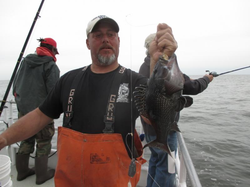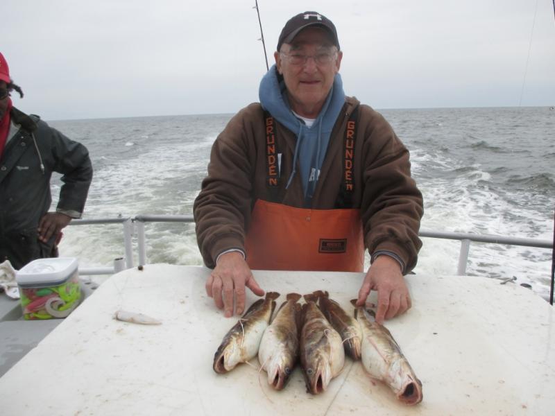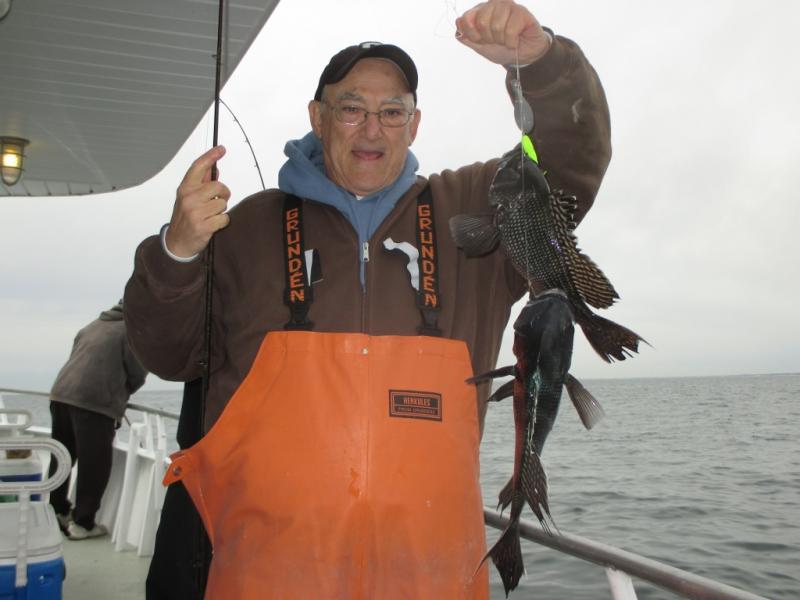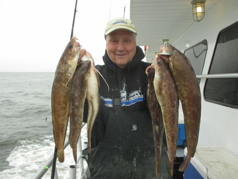 Two days of strong west wind helped the bottom fishing. Most guys averaged 10 or more ling today and a lot of nice sea bass and tog. Plus 3 cod today Our first and last drops of the day were best and pink was hot on the last drop. The ling were full of crabs plus tiny porgies and squid. Steve started the day with a nice double header sea bass and had 5 ling on the last drop including the pool fish.