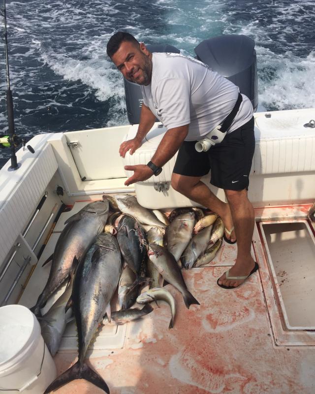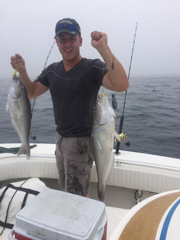 Employee Sebastian to enjoy his first offshore trip. Started out to 1/8 mile visibility of fog from inlet all the way to the canyon. Made a stop at an offshore location And trolled up a 30'inch bluefin. With no visibility figured we were better off bottom fishing till fog cleared, hit a wreck and got a dozen baseball bat ling, then hit the tile grounds and landed a dozen golden and huge blue lines. Made a run to next Tuna spot inshore and fog finally cleared, a few minutes later we spotted thousands of bluefin tuna on the surface. The boys went to work, Landing 2 unders and an over in no time and could have kept catching and releasing but opted to head to the barn since the boxes were full!