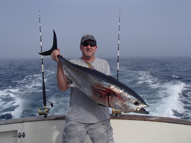 Hosted our annual Exploratory Overnight Canyon trip with my son and grandson and four regular customers. Started at the tip of the Hudson in 75 degree water and had action in the afternoon picking four small yellowfins only keeping one for the table. Trolled down the west wall and up the east wall with no bites but we witnessed the largest concentrtation of dolphins and pilot whales I have ever seen, acres and acres of life. Set up for sharking on the west flats at dark and were inundated with dolphins the entire night with one shark bite off for our efforts.. Just before dawn fog rolled in and stayed with us till 9 am. Trolled the tip area again with no bites and ran to the Tower area hoping for a Bluefin. Trolling just past the tower the way back islander/ballyhoo rod went off and we fought and boated a 43" Bluefin which saved the trip. Calm weather, family time, good friends and some tuna action for our first offshore trip. Priceless!