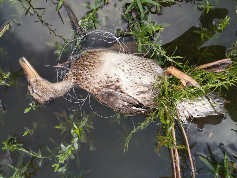Found a dead juvenile hen mallard attached to vegetation with discarded fishing line in a flooded field in a park yesterday evening. Too bad I didn't get there earlier and rescue it.