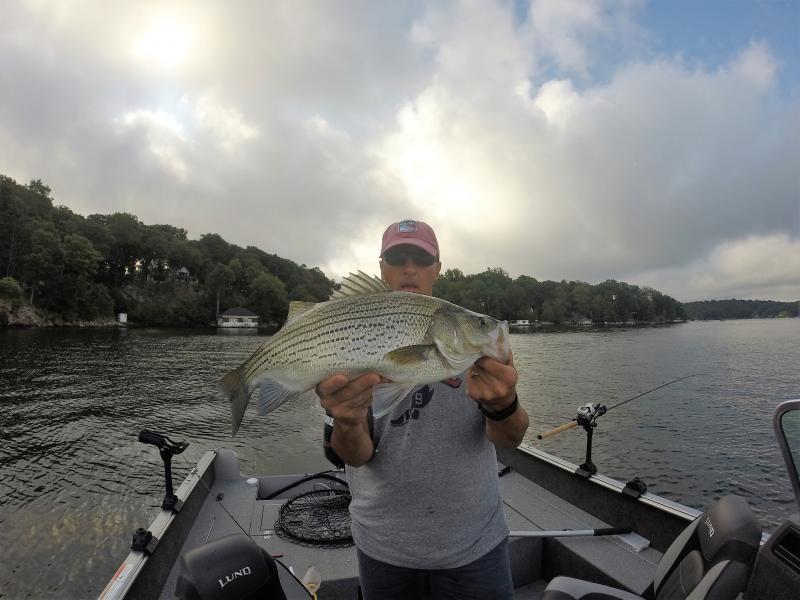 Sunday I started where I left off Saturday. Not much happening so made a move to where I started Saturday. The water was cleaner and the hybrids were there chewing. They were shallower than they've been lately. I hooked 12 and landed 9. I left them chewing because I was tired of getting waked..ugh! |