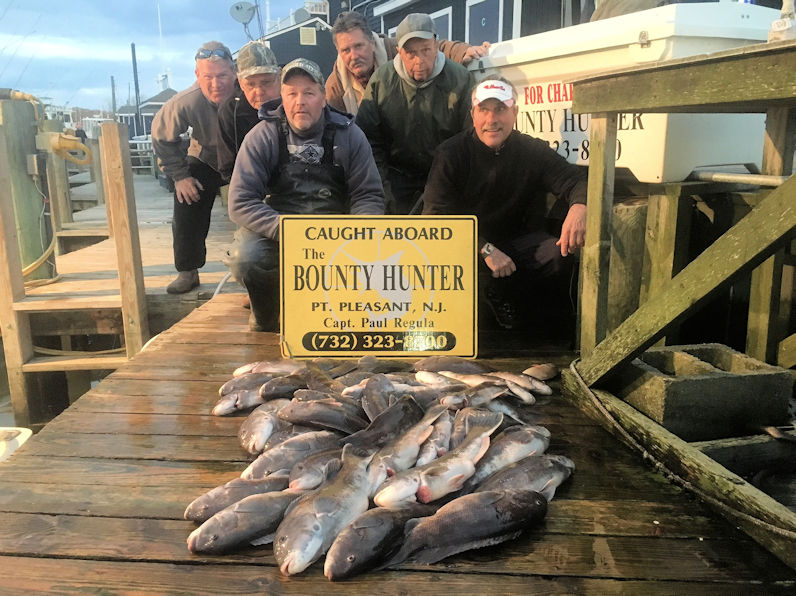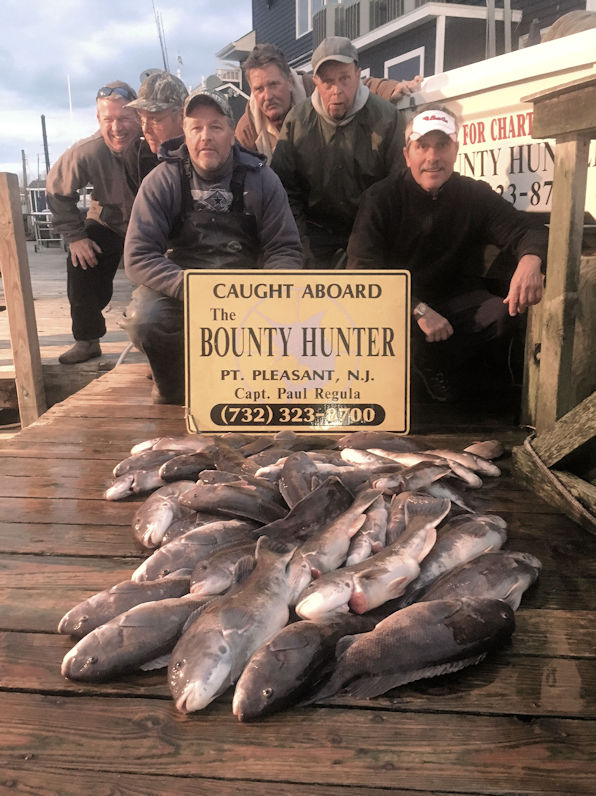 The Matt MacSherry charter returned to the Bounty Hunter today. Filling out the group were regulars Mac, Greg, Mick, Dave & Gary. Paul ran up to the rough bottom and made stops on several piles. The early morning fishing was slow with plenty of shorts. It took a while to get the bigger fish to turn on but once they did the patience paid off as the crew put together a limit catch of 36 nice size Tog.