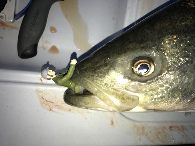 Pulled out of marina in Keyport st 5:30pm with friends Jersey Joe and Christina. Found some good marks and picked up 3 keepers 37 to 39" and shorts. Christina did great with a double header. Back at the slip by 7:30pm. Nice quick trip and fish for Good Friday dinner. Captain Quint mascot was almost swallowed hole!