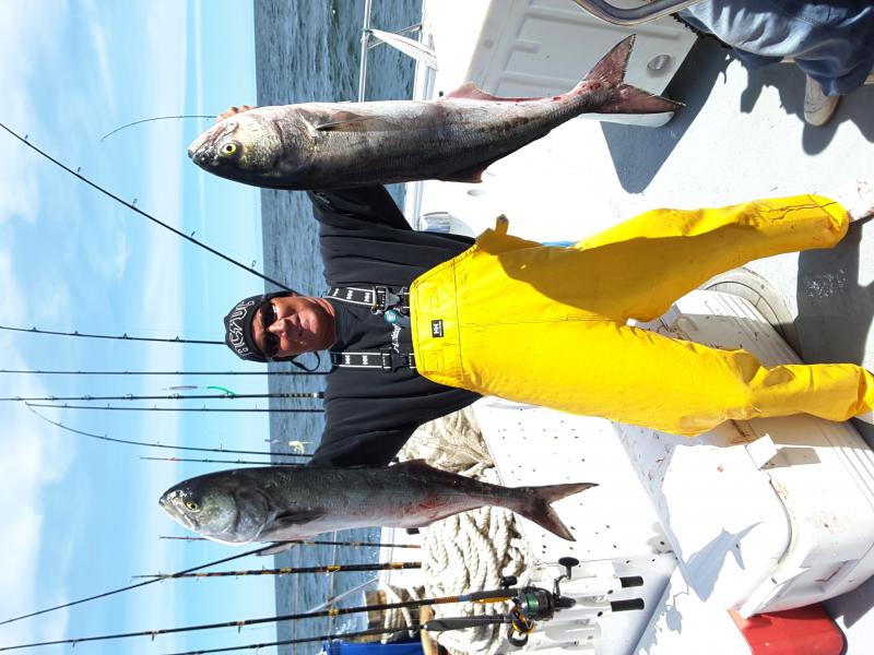 Another crazy day of BLUEFISHING aboard the GOLDEN EAGLE. It was very very good fishing and let me say around mid-morning we had one of the most insane hours of BLUEFISHING you'll ever see, it was 20 fish on at a time, as fast as you could get your line in the water you had a fish. The BLUES ranged in size from 3 to 14lbs and everything was caught on Run Off Hammer jigs with tails and/or Croc's.