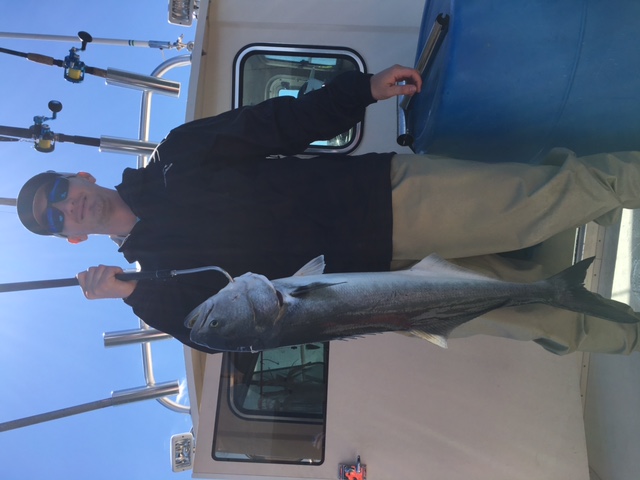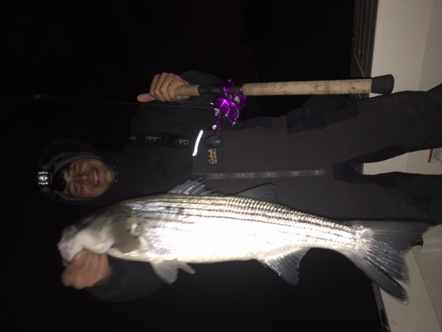 Monday PM : Had Brandon, Dave, Andrew, and Lou out in pursuit of the striped ones. Ran out to a new area found some marks and had perfect conditions to chunk. from 6pm to 8pm we had insane cast and reel bluefishing. Once the tide changed we reset on the anchor and had slower bluefishing but more striped ones in the mix. If we landed what we hooked we would have had close to 20 bass, but the new guys had a tough time figuring out how to catch bass on bunker heads. Great night with barely any wind and beautiful conditions.