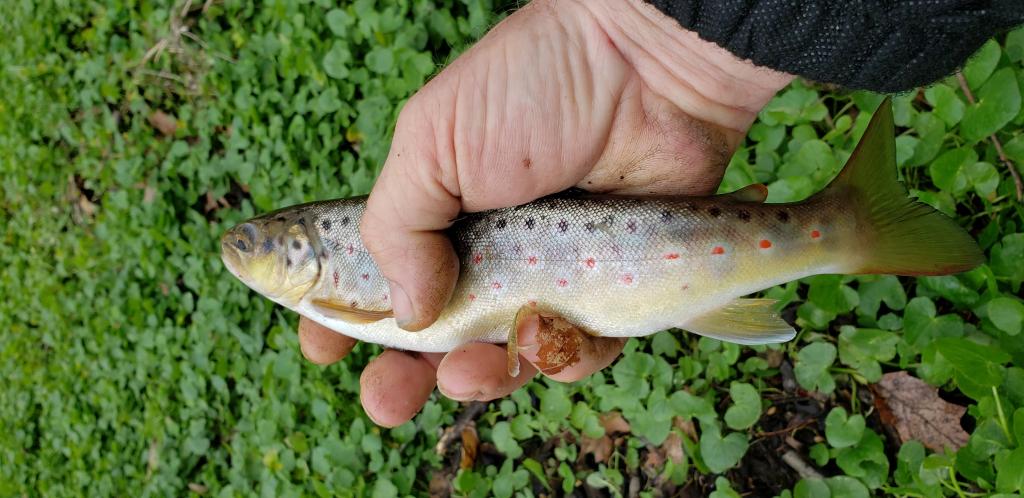 Fished a local stream after work today. I usually get more Browns than Rainbows there but today it was the opposite. I fished my way upstream and landed 3 Rainbows, 2 Browns, and 1 small Largemouth. I was surprised by the stockers that I got, they were no mud sharks they were airing out more than the wild Browns