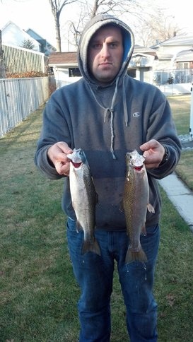 After thinking about all the advice from you guys about Delaware river and walleye fishing me and my cousin decide to try round valley for the first time. We got too the bait shop around 6 only to find out they open at 8 so we went to get coffee. After we got bait we headed to the valley and got on the lake around 7:30 because the guy opened the bait shop little early, the guy was great help about what to use and other advice. Put the boat in and went to park the car, while heading onto the ramp I slipped on ice and bruised my knee, what a way to start lol. After all that we went to a first stop cast out shiners on one side and I cast out a binsky in about 60-70 ft of water and caught my first 17 in. lake trout ever. Then about 20 min. later my cousin used a gold binsky and caught 2 15 in rainbows. Lost a bunch more on binsky but not even a hit on bait. I love using the binsky now an love catching that lake trout I hope I catch more. Had to leave around 12:30 because the lights were blinking I guess because of the winds. Beautiful reservoir and I took the trout for the family, but ive never seen meat that pink like salmon. Never taking them again because fishing is a hobby and these fish are too nice.