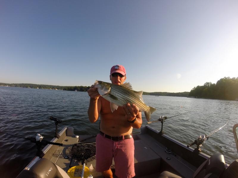 I haven't had a chance to fish in over a month due to my kids softball and soccer tournaments. Finally had a small window Saturday morning , so I headed to the big lake. Got some herring from Dow's and set out my spread. I saw a lot of marks 15 feet down in 30-40 feet of water. Made the adjustment and picked away at stripers, walleye, smallmouths and perch for three hours until I had to leave for a softball game.