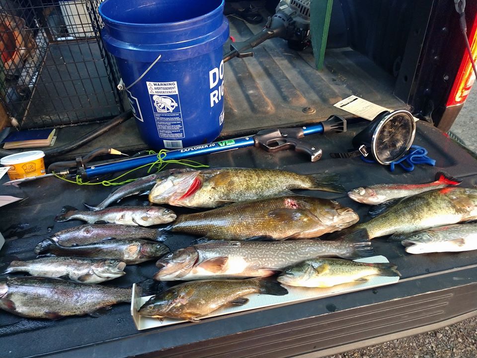 Fourteen fish - a collection of rainbow trout, tiger trout, largemouth bass and smallmouth bass - were in the bucket. All but one fish had spear holes in them. Seven summonses were issued for the violations, with penalties totaling $880. The cited violations included: fishing without a valid license, possession of trout without a trout stamp, taking bass during closed season, taking undersize bass, taking trout over the limit, and taking fish in an illegal manner. If you witness violations or illegal activity, please call the 24-hour DEP hotline at 877-WARN-DEP (877-927-6337). |