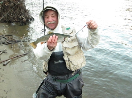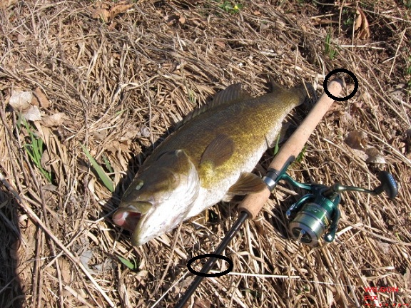 . Andy measured my rod from the butt end up and we compared it to the pix. The circles indicate 21 inches.We figure the fish was 20 inches at least. Hefted like 5 lbs. One of the biggest SMB I ever caught. Frosty in the early going with iced up guides. Warmed up a bit then the wind started a blowin. The way this winter has gone we will be in the dog days of summer by June ![]()