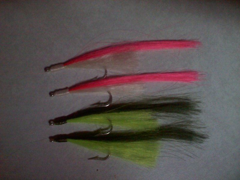 Adding some new twists to the synthetic teasers this year. Now making in the "Kellie" green and chartreuse with olive wrap as pictured below. Also, now making the teasers with a longer top/back hair (4in). The added length gives the teaser increased action when jigged similar to that of a bait fish. This can also allow for a trailer hook to be added with a swivel or tubing and be covered by the longer hair.