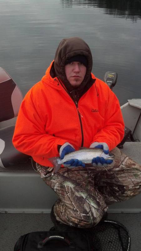 Went fishing to round valley since last week stomach flu kept me home during a great warm winter. Got there around 7:30 and headed towards the north tower using the binsky! A couple guys were also using the binsky and having better luck then me and my cousin. Wind was the killer for my boat and thought we were going to have a horrible trip! So headed by the south tower, fished rangers cove and there were also a couple hunters around there so didn't want to get to close to them. I was so happy the wind stopped for 1 hr or 2 and I caught one 13 in rainbow in that cove took the binsky out while in the water took a pic and released it. Then drifted into 70 ft of water and caught a 15 in. laker no pic just let it go. Then after about 20 min missed about 2 and caught my biggest trout ever a 22 in lake trout biggest freshwater fish this yr. My cousin didn't catch nor have a hit till about 12 he caught 4 in a row and I missed what had to be a beast line was peeling out and was gonna tell my cousin to follow it with the boat but it popped off. Damn another one for a fishing story!! Cant wait to go back. All fish were released to get bigger! But I have a question are there wild lake trout in there? Out of all the lakers I've seen they were light colored this one had such amazing colors on him. Didn't take a pic though.