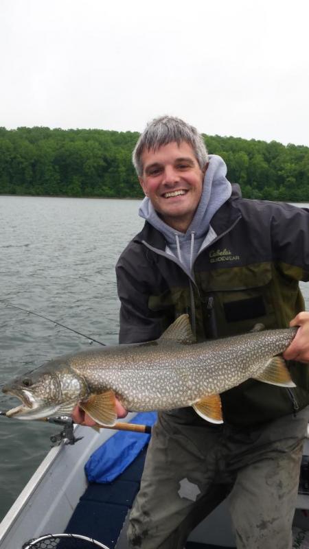 Thank god he wrapped himself in the leader so it took SOME fight out of him. The big browns run all over the damn place and its hard to keep up with them. Took us about 10 mins to get him in and he took us pretty much across the lake. Action slowed a little but we caught a few 20" browns here and there and missed several really good run offs..mainly because we were still celebrating and passing to the right lol. Then I was up FINALLY. We were in 30ft of water and got a nice slow run off. I set the hook and for a minute or 2 I thought it was bottom. Then the head shakes came. The fish did whatever he wanted. Finally got him up to the bow and saw it was a beast laker, he saw the boat and it was game on. Whoever says lakers fight like a dishtowel has to catch the active spring ones in shallow water. I think their lack of fight sometimes has to do with being very deep. Finally landed him and he was 30" and weighed in at 10lbs. Kept him and gave it to the parking lot attendant where I park for work that evening. He said it was delicious. Fished some more..missed some more due to celebrating...called it a day and went home. We accomplished 1 preseason goal today and got the brown we were looking for. Let the big ones live ![]()