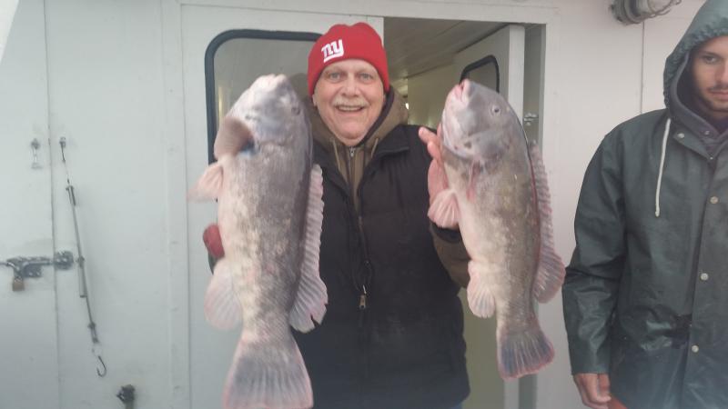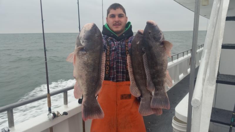 12-3-14 A little rain and a little swell but other than that not a bad day out there..We caught some fish to,,nothing great,,a pic at times,,,dogfish were a pain in the butt to but some of the guys caught a limit plus of blackfish,,some had a few or three etc...some guys had it tough and were sharking all day but it overall I though it was ok..Will(riverbassfishing)ended up winning the pool today,,actually had a tie for the ten dollar pool but he went home with the money for the most part...He ended with one short of his limit,,,,The ocean was settling down nicely with the west winds and tomorrow is looking nice,,Friday as well,,,See ya tomorrow!!!!!pics