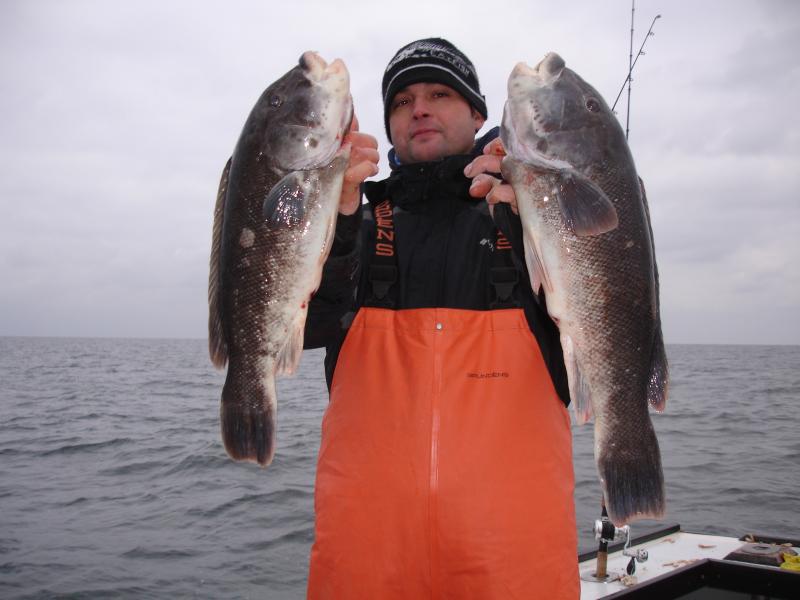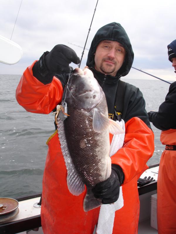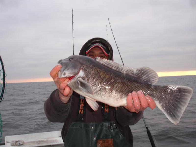 We ran an open boat Tog trip today and had to make several drops to put a catch together. It was a pick on some drops and others were stiff. Danny was putting on a show today catching 16 keepers (orl) , Brett had 8 (orl) and Ron had 5, everyone else down from there. The pool fish today was around 7 lbs and was caught by Danny.