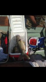 Bad Pic, little boat 2 ft waves!! 40 qt cooler, tail hung over the back!! Measured at home at 29 inches spot on, he was thick!!! a true Walleyesaurus!!