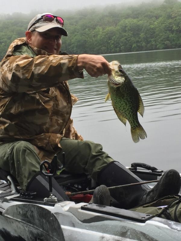 We stopped and fished a few shorelines and coves, but our main objective was to reach the island and fish all around it. The first hour was pretty dead with only sunnies nibbling at our baits. We were tossing 4’ Keitech swim impacts in light to dark silver with glitter. After starting to get annoyed with the smell of skunk, we switched to a pumpkinseed Keitech sexy impact. BOOM!! My buddy landed a fish and I joined with a double header on the first cast with pumpkin seed. My Personal Best Crappie to date. Maybe you boys have secret lakes where they get bigger, but these things were biggest ive seen with my two eyes. Ha! We picked off the occasional dink bass / pickerel or panfish on the way to the island. We arrived and entered the skinny side and started nailing pickerel and crappie. We reached the mouth and we caught a few nice Smallies. The bigger one I’m holding was 2.3lbs on the digital scale. I surely thought it was bigger by way it fought. For a second I thought it might have been one of them Hybrids they stocked. The action slowed down so we changed over to a Silvery Keitech swim impact with blue top and blue glitter. This seemed to get the bite going again. The sunnies there are very aggressive as we kept losing tails on baits and hooking some on. We had 1/0 and 3/0 hooks and these guys were still managing to get on. Crazy!! My Buddy also picked up with PB crappie on one of the feeder coves. On the way back we caught a few more as the rains started coming down. We called it quit by noon. Final count 11 fish me and my buddy taking the tie breaker at the end with another aggressive gill on a 4’ worm. What a great place the Rock is. That was only my second time there and only my first time really fishing it. With the exception of the cat fish and the Hybrids, I think we caught every species. LMB, Small Mouth Bass, Yellow Perch, Pickerel, Black Crappie, Bluegill, Pumpkinseed. |