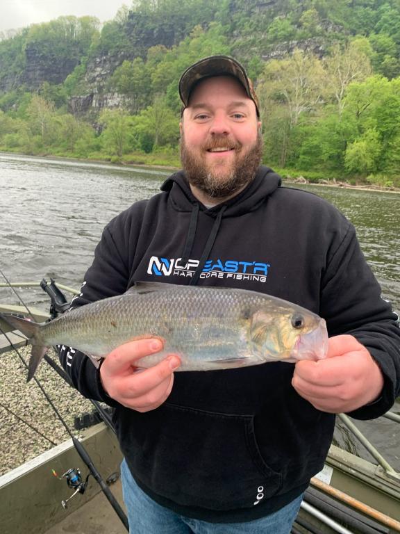 What an awesome day of fishing the Big D! Met Capt Tim at 0600 & we had lines in water by 0630 & Devon had the first shad by 0635! It basically didn't stop from then until we went in. Multiple double hookups & even a few triples! Yours truly also landed a solid river smallie which made me win specie war. Of course we landed the 666th shad of the season for capt tim but we quickly made that 667 & we headed in after that 1 as the weather got really Murray pretty quickly. We landed over 50 for the day & lost countless more. I hadn't shad fished since high school & wanted to get dev a new specie for her bday. I debated buying waders & all the tackle but then Sharky said he went with a guide & beat the b@lls off them. Needless to say we made the right call. Capt. Tim knows that river like its his backyard just seamlessly guiding around the rocky, depth changing river. He's also mad cool & we sat there bullshitting for 8hrs just laughing the incredible fishing was just a bonus def need to have some beers with this dude. If you wanna go on the D give him a call. We are gonna be back for shad every year and think walleyes & smallies will be coming as well. Delicious shad fillets for days.