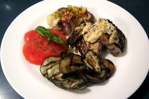 Broiled Bluefish with a Chipolte sauce, Grilled Zucchini, Eggplant, Jersey Corn and Jersey Tomato.