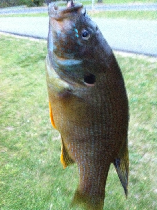 A buddy of mine caught this thing in a lake in N Jersey this evening. It was 9" long, and put up one helluva fight on ultra light gear and the mouth was big enough to fit what looks like a 3/0 in it