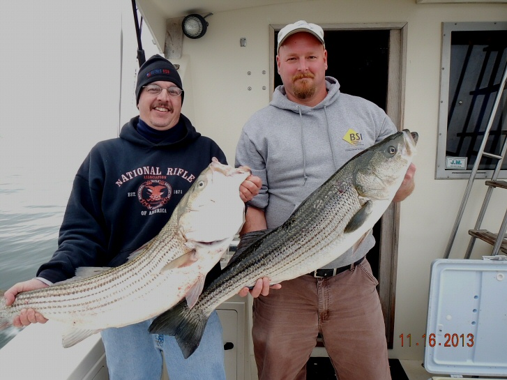 The great Striped Bass fishing continued today on the Bounty Hunter for the Bill Zuchero charter. Along with Bill were fishing buddies Walt, Chris, Ron, Matt & Jon. Paul made his way back to yesterday's spot but found vey little in the way of bait or Striper activity. A move of a few miles put us right in the middle of the feeding Bass. We Trolled a few and Jigged a few and by 11AM we had a Limit catch of 12 nice Bass in the box along with 6 Bonus fish. The split today was about 50/50 between Trolling and Jigging. The Bass bit just about everything we put in the water. Over a dozen short Bass were released but we did keep 4 big Blues. It was another good day of fishing with a group of longtime Bounty Hunter supporters. They will return next week and hope to pick up where the ended today.