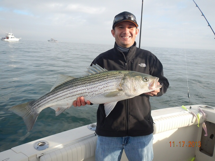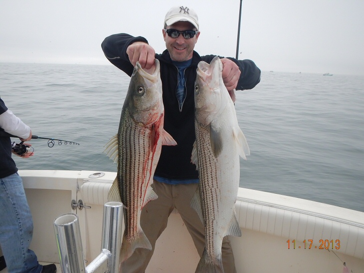 The David Guthain charter was on board today. Along with Dave we had Randall, Ryan, Patrick, Pat & Gary. The excellent Striper fishing continued for us today. We started the day Trolling but once hooked up the crew worked the Ava's. We had a steady pick of Bass for the first few hours alternating between Jigging and Trolling and the guy's put together a Limit catch of 12 Bass plus 4 Bonus fish by 10AM. We then spent the next hour Jigging and releasing some Bass. When the dense Fog rolled in we decided to call it a day.