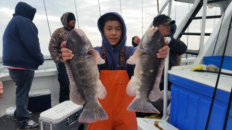 11-30-14 Time is flying ,,cant believe its December tomorrow already..Anyway we caught some nice fish today,,the two pool fish hanging were over 10lbs..James ended up taking out Russ just barely for the pool,,nice one to at about 475 bucks..Russ was high hook though with almost two limits of blackfish,,James had some nice fish as well,,as did others,,,guys did catch limits of fish and some had 2,3,or 4 but a lot had none,,Just not a good bite as a whole for the boat....IT got pretty lumpy on the ride in so I did not get as many pics as I would have like but here are a few...Tomorrow we are looking good again,,,,so see ya in the morning for coffee....