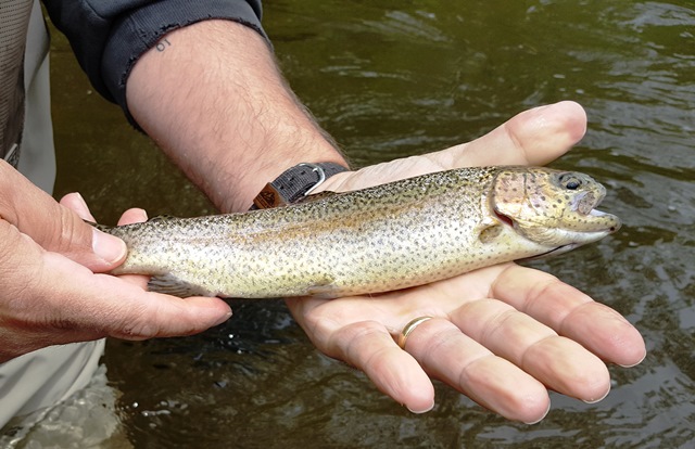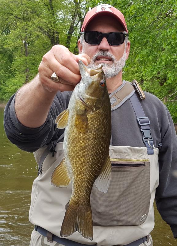 The wife and I took the day off yesterday to try to get out on a PM open boat for the striped ones and some blues. Not enough guys so the trip was cancelled. No problem...we put on the waders packed up some lunch 200 lbs of tackle 10 rods and headed to the river. I tend to over pack for these things. Figured we try for some trout and smallmouth. First stop 2 minutes from home on the NB which was supposedly stocked on Wednesday to try to get the wife her first NJ Trout....not a tap or fish in sight. Headed to Duke Island Park to have our lunch and regroup. Decided to hit a little stretch there before leaving. Fed up with the trout thing I switch to small mouth gear and Donna stays with the ultra light for trout. Look upstream and guys lined up as far as we can see so we go down stream a bit a find...of course...trout galore. Donna gets her first NJ Trout (little guy pic below) and then second and third and continues playing with them as I aimlessly throw lures to the smallie empty abyss. So we decide to leave and head to a different spot and bam I'm snagged...on a beast smallie that is. Turns out to be a nice thick 20" fish. (last pic below). Then we head a bit downstream to a part of the main stem and get into several small mouth each as well as find another pod of stockies. The "larger" bow pictured below actually hit a 4" green pumpkin Senko Texas rigged weightless on a 1/0 hook. Fished for a few more hours and had a blast. All smallies caught on Senkos and all trout caught on Panther Martins 1/8 oz Black with yellow dots and gold blade. Some pics to prove it happened.