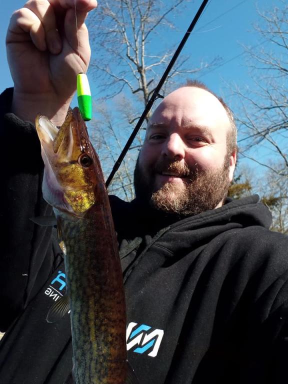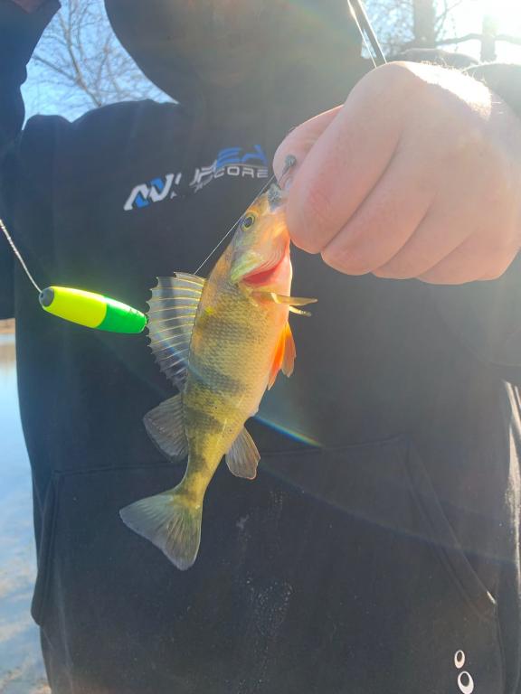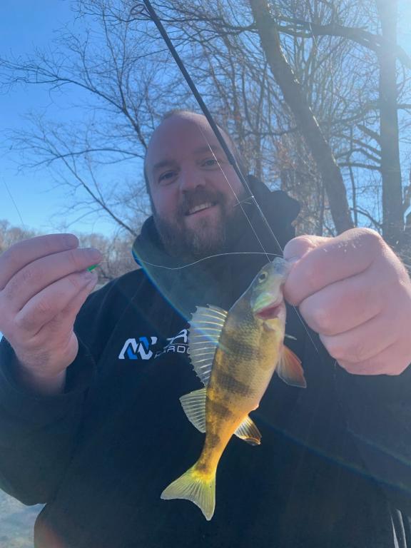 2/20-Well after loading up on minnows from Sharkys in northeast philly for my tour of coal mining country tomorrow aka deep south jersey, Devon refused to let me not let her cast some. Tried college cockolla water ice cold, skim ice still on smaller pond but 1 cast 1 perch for me & nothing else for us. Spring be here soon I hope. Also Sharky's new gulp minnows are so life like