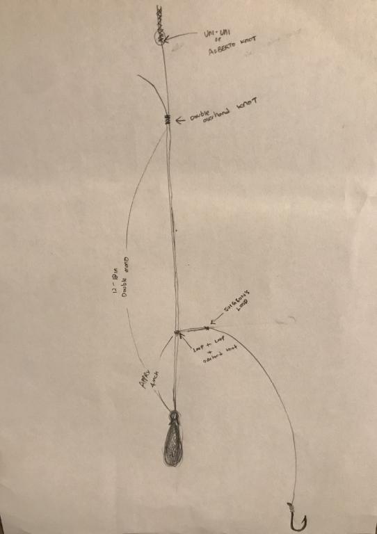 Thank you! I think I got it now. I had some spare time this afternoon and decided to use my imagination ![]() Tie alberto knot to connect 24-36 inches mono leader to main line. Fold the mono leader in half and tie a double overhand knot. Below overhand knot, There is 12-18 inches ‘double lined’ mono leader with sinker attached to the end. 4 inches above the sinker loop, use loop-loop connection to attach snelled hook. Tie an overhand knot over the loop-loop connection. |
