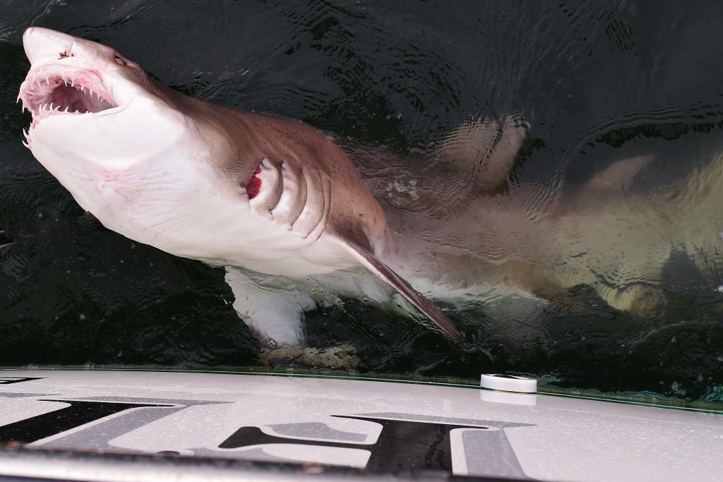 You never know what might be swimming off our coast. Don't be embarrassed to mention your unlikely catches. Catching and releasing a 150# class sand tiger shark off Bay Head on a fluke rig with 20# leader, ranks up there on my unusual list. Sand Tiger at the Axel Carlson. |