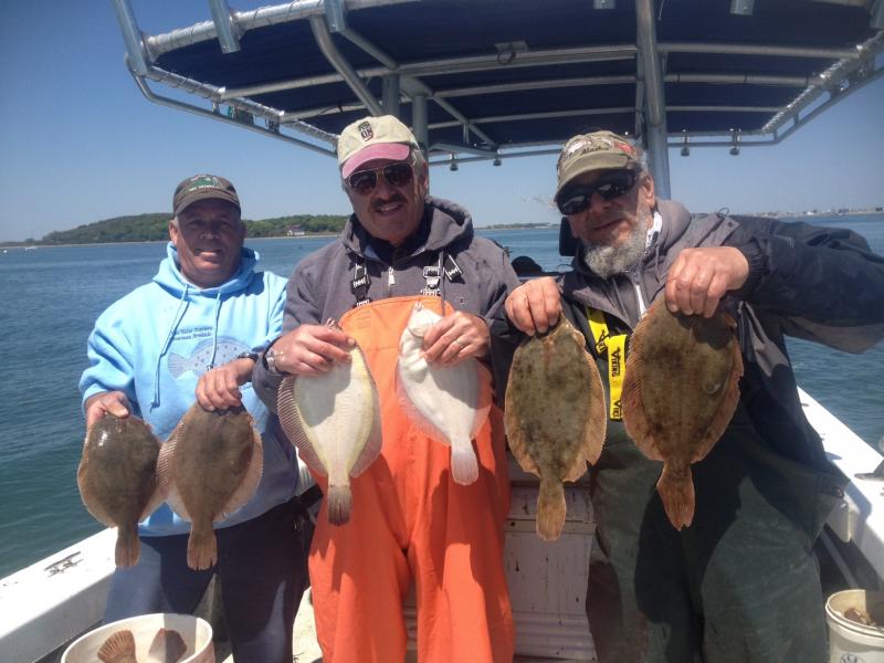 With 6 people (plus me) we could have taken 56 fish but I was determined to save my limit for the afternoon trip so I figured these guys didn't need "my help" and when we got to DIF I started cutting fish while they resumed bailing fish and releasing the ones under 15 inches (unless they were bleeding). While that bite was going on we got the biggest flounder I've seen (so far) this season at 18.5 inches (2 3/4 lbs). During that melee a few stripers, the 1st of the year, also jumped into the boat but they were all short at 20-24 inches. I then had people that wanted to go out for the afternoon and that was a continuation of the mornings bite: The afternoon limited out quick (by 2 pm!!!) and were "quite done". To say we had happy campers today would be an understatement! Best yet, with the up tick in sizes we saw today, things look very positive for the Santini Contest on Saturday. I'm really looking forward to that! Captain Jason Colby