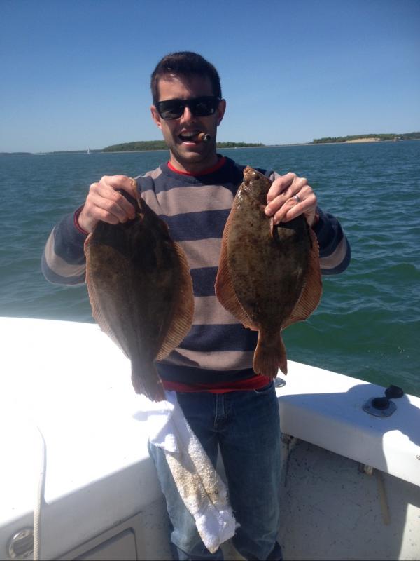 Pictured is Mike Jr with an 18 and 18.5 inch Quincy flounder. He is now juiced up to come back and get their bigger cousins when the conditions are hopefully more favorable..........JC (something wrong with the picture loading-sorry!)