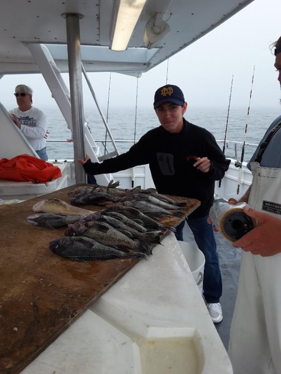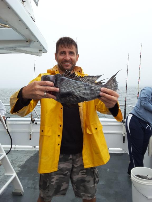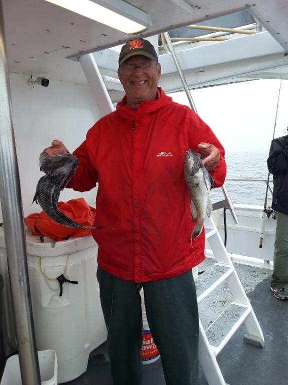 Even though it was raining today, the ocean was calm and it was EXCELLENT SEA BASS fishing. We had a complete boat limit of SEA BASS and some LING. We caught a few BLUES but not as many as yesterday.