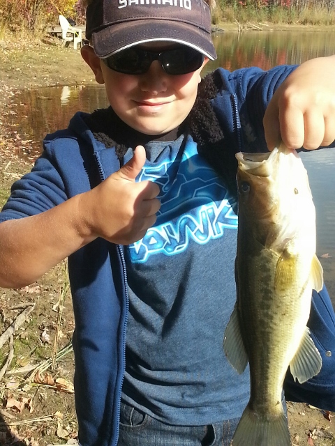 Well after the blow on Saturday was not feeling like fishing on Sunday but my daughter had the itch and my nephew was up from Virginia so off I went in search of some shoreline fishing spots to take them. Checked three or four different spots which didn't look to promising and ended up at a puddle near by HOPING for the kids to catch some fish. I set my nephew up with a shiner and float set up while my daughter live lined her's and I chucked a spinner bait and rattle bait in between. Well my daughter catches a small pickerel which was cool cause we watched it come up and swallow the shiner right in front of us. Then I catch a largemouth on the rattle bait. No love for my 10 year old nephew so I move him down the shore a little bit and he gets a bite. The fish is chasing the shiner on the top and hit it three times before it took it down. My nephew is so excited he forgets to set the hook and starts reeling, losing the fish AWWW! So I set him up again and told him next time to cross his eyes showing him how! Sure enough five minutes later I see him slam it home LOL! He's yelling I crossed his eyes!!!! His first largemouth! We had a good laugh and took a pic and released it. YEA finally everybody caught a fish and we can go home right? NOT neither of them wanted to leave now so after about half hour they both catch largemouth's