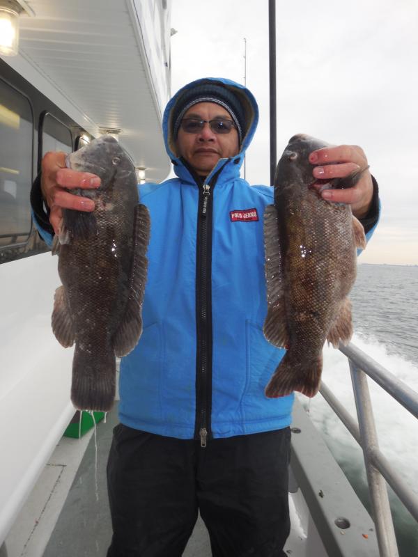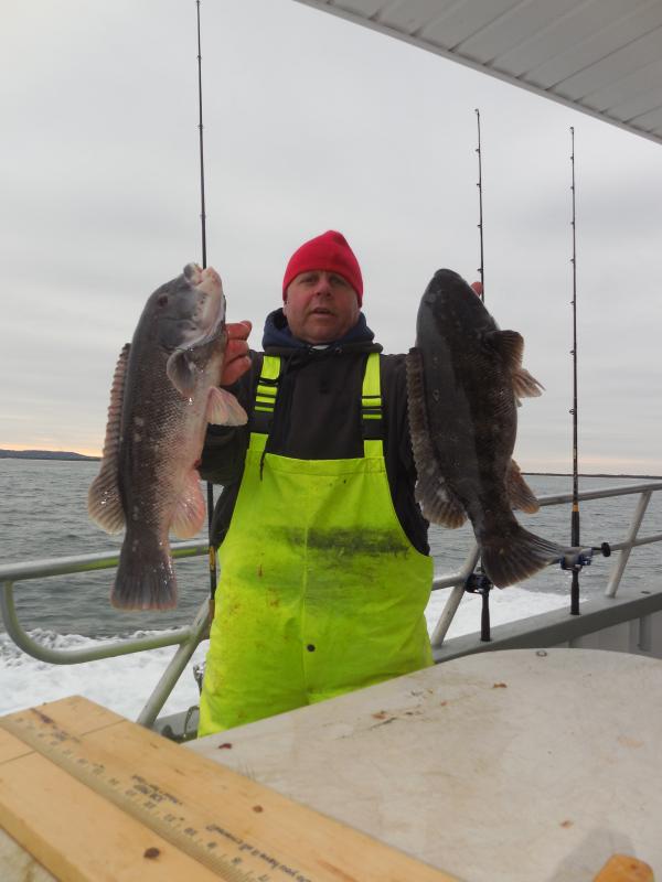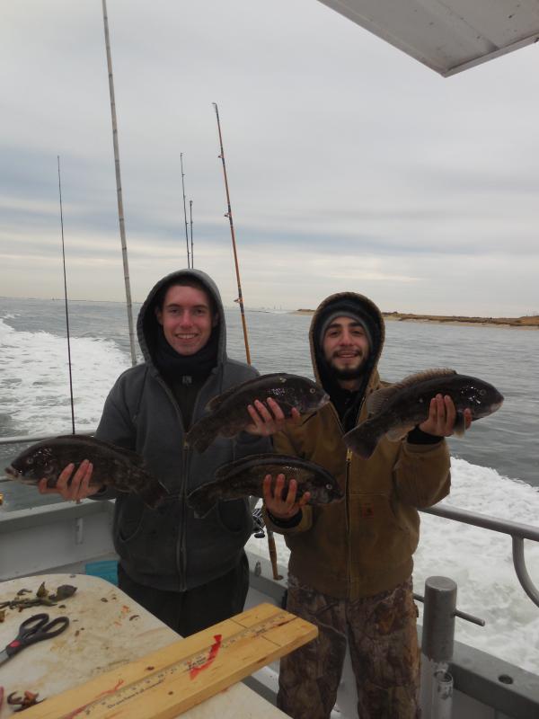 Hey gang, Capt. Scott here. I just spoke with Capt. Glenn and he said it was an ok day for togging. The best fishing was in the morning. He said they boated some nice ones today and it was a lot better than the day before with the wind. He said he'll see you in the a.m. Pictures will be posted in a little while. Thx., Capt. Scott Heated handrails, green crabs supplied, white leggers available.