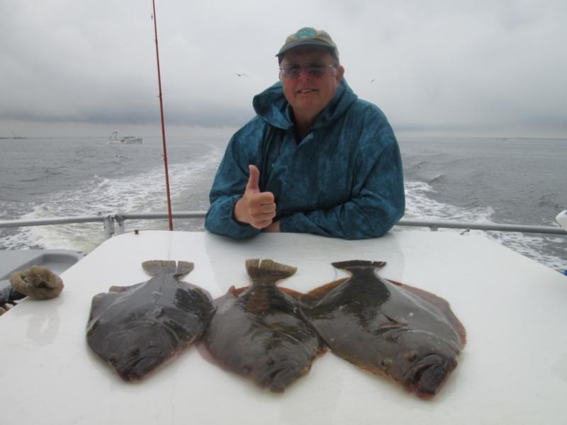 It was a light crowd today and you needed your rain gear. The government is clueless on fluke management. They continue to raise the size limit forcing us to target larger fish and then say the breeding biostock is down. The fluke stocks rebuilt with a 14 inch size limit and is in trouble with an 18 inch size limit. Don't you think maybe we should go back to the 14 inch limit? I could have caught all the 16 and 17 inch fluke you would want but there were no keepers there so I spent most of my day on the big fluke grounds. Marvin Tyler from Newark had the pool with a 8 1/4 pound beauty. Jim Custer had two 6's a 5 and a 4 pound fluke. His picture was taken with three before cleaning and added his fourth on the last drift. We had another 6 and 7 # fluke in todays catch.
