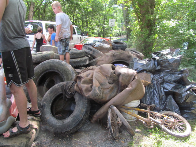 Pool liner, bike, over 80 tires, lots of junk and metal.