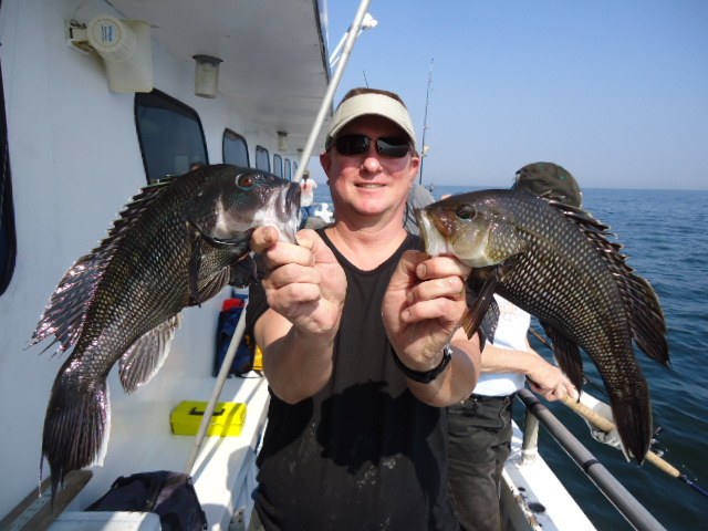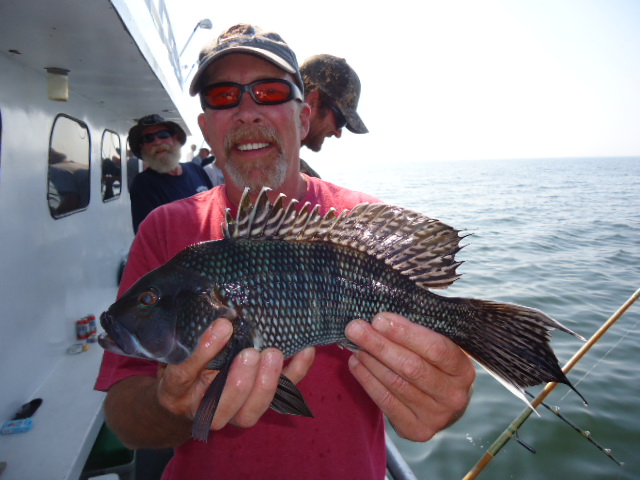 10-4-13 We had a really nice day today,,,again,,,trust me I am not getting sick of saying it..Flat calm and warm..Caught some really nice sea bass today as well..Just check out some pics here below..Jimmy in the first picture below took high hook award with 18 nice sea bass..He was doing no wrong today,,others had different catch totals,,some high some low,,,but overall for a decent crowd I though we had a pretty good day..Lots of manuvering looking for a good spot that had life,,,some little honey holes helped to..some spots were dead,,,had to move on when we had no life.Jigs,,Jigs,,Jigs,,,some did real well with em if you were doing it right..a-27 with no tails were the ticket.The fish are full of sand eels and very picky it seems like..I could get on some great readings and only pick at the fish but sending a jig down would sometimes get a nice fish to attack it.We also had to throwback some nice fluke,,some giant winter floiunder and we caught some ling as well.Oh,,also quite a few big eye mackerel which make for some nice sashimi........TOMORROW LOOKS GREAT,,GET IN AND GET ONBOARD CAUSE WE ARE GOING BACK AT IT AGAIN.....WEATHER LOOKS GREAT....BRING A BAIT ROD AND JIG ROD..SEE YA IN THE AM..PICS