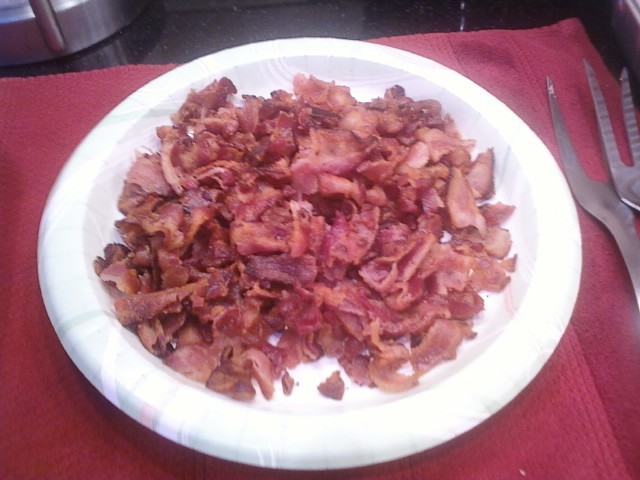 COOK BACON 1 1/2 LB SLOW IN BIG FRYING PAN UNTIL CRISP THEN PLACE ON PAPER TOWELS TO DRAIN GREASE. POUR MOST OF THE BACON GREASE BUT SAVE SOME IN THE PAN.