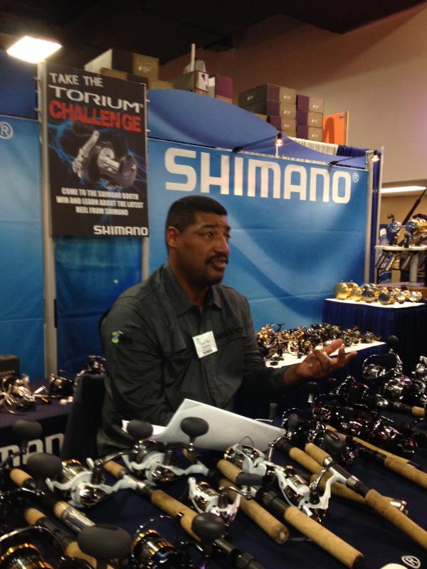 Fred knows fishing and he's sharing stories, knowledge and dance (salsa) moves at the Shimano booth. Stop by and say "hi", and while you're at it, have him show you some of the Shimano tackle he uses. I was able to check out the new star drag reels, a sweet electric reel, the new long cast surf system, and a display of rods for all sorts of situations. I was impressed with their booth and the knowledgable guys who staffed it.