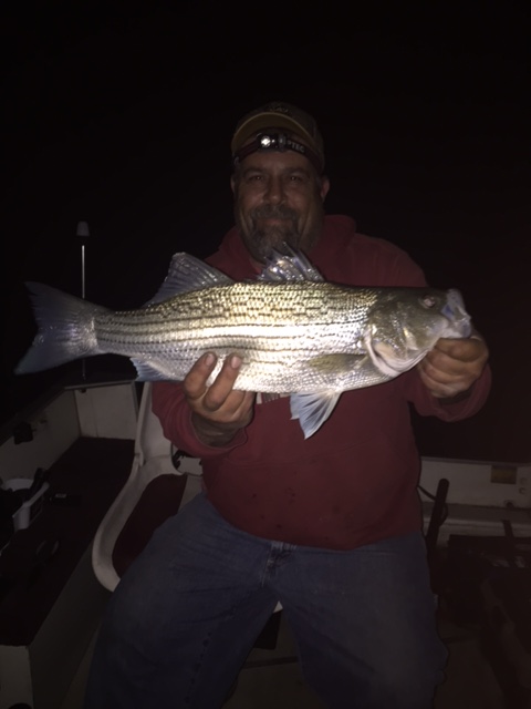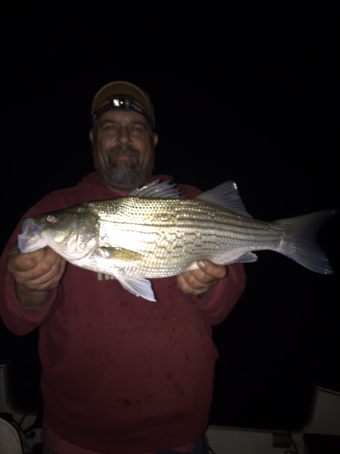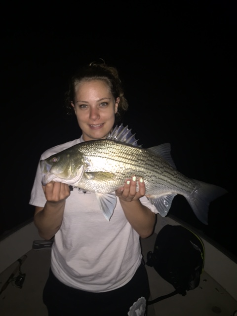 Got at it w dale and Kelly fri night. The mission: landlocked linesiders. On the water around 11 pm, things felt and sounded promising. No wind, overcast, light drizzle. It smelled fishy. Fish were blowing up everywhere. First up was dale w a small but chunky largemouth. Shortly after he nailed a long hybrid. Solid fish. Up next was Kelly as she casted from the bow... Bam! Thickest fish of the night. Prob a solid 6 lb fish. Then we hit a very long lull but kept casting. I finally hook up and drop the fish near the boat. Dammit. Keep casting. Hook up again... Dropped it. Wtf!?!? Keep casting. Meanwhile, dale hooks up again, fish goes ape shit and we net a solid fish. I'm getting antsy now and dale is doing his damndest to keep us in position. Then I get blasted. Missed strike. Few more casts, bam! Another one on. 10 seconds into the fight, pulls the hook. You've gotta be kidding me!! Now it's raining harder, the clock is ticking and I know my window is closing for the night. I keep casting. Then boom! Another hook up. Thankfully this one stuck... In more ways than one lol. Net the fish, get it on deck, and I grab the long nose pliers to extract the lure. I dunno how it happened with long nose pliers and me being my normal careful self, but the fish flipped and shot the front end of the plug outta the net and buried a hook thru the ring finger on my right hand. I lip the fish, ask dale to cut the treble from the plug, remove the hook, Kelly snaps a pic, I release the fish. I look down at the finger, assess how deep it went and dale asks "is it in the bone". Thankfully it wasn't so he suggests we try the old string removal technique we've seen in YouTube vids. I position my hand on a side storage box, dale wraps the hook, angles it properly, asks if it hurts lol, then wham! Pop! Out comes the hook and the high fives lol. So not only is dale a good guy and quality fisherman, he's also a pretty good on the water mechanic and surgeon. After that we called it a night as we were soaked and it was 330am. Good times aboard the getanet 2!!!